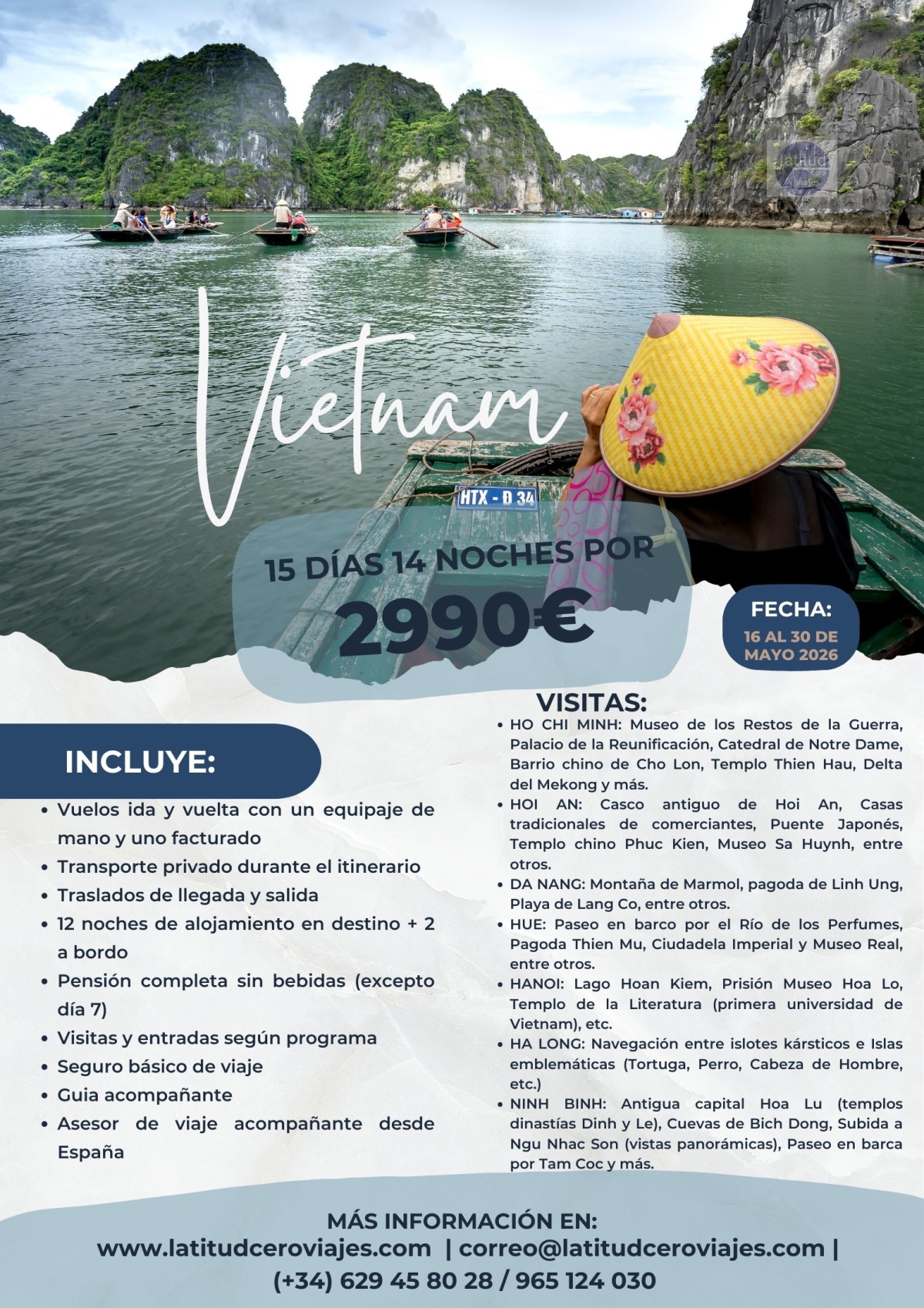 • Vuelos interno: Ho Chi Minh – Da Nang (zona sur – zona centro) y Hue – Hanoi (zona centro – zona norte)